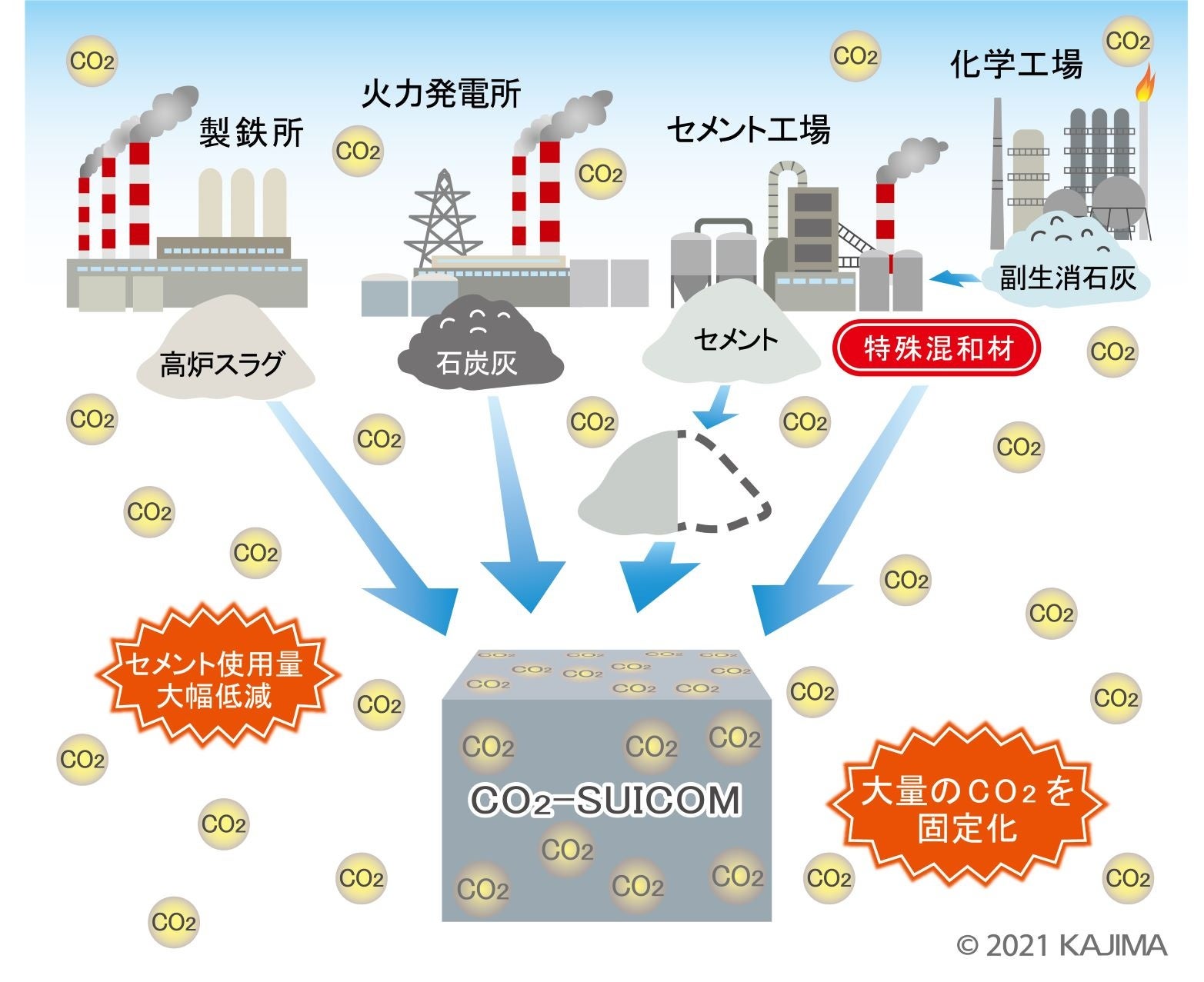 「CO2-SUICOM」は、コンクリートの主原料となるセメントの半分以上を特殊な混和材「γ-C2S」(ガンマシーツーエス)と産業副産物に置き換えることで、セメント製造時に排出されるCO2を削減します。さらにコンクリートの製造段階で強制的にCO2を供給する「炭酸化養生」※1を行うことで、コンクリートが固まる過程でγ-C2Sが大量のCO2を吸収・固定します。