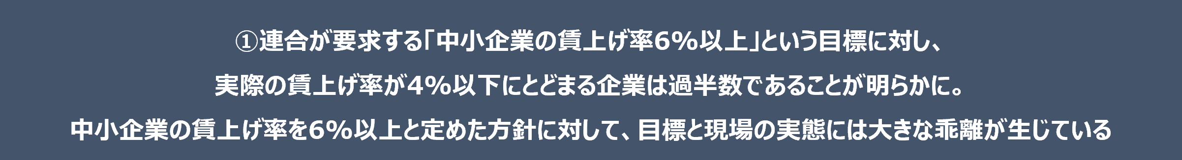 ①連合が要求する「中小企業の賃上げ率6%以上」という目標に対し、実際の賃上げ率が4%以下にとどまる企業は過半数であることが明らかに。