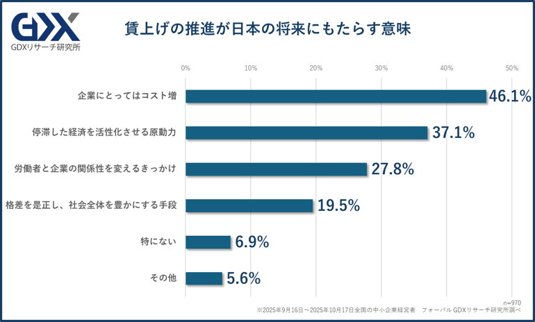 賃上げの推進が日本の将来にもたらす意味について尋ねた質問では、「企業にとってはコスト増」(46.1%)という回答が最も多く、次いで「停滞した経済を活性化させる原動力」(37.1%)と続きました。経済を活性化させる原動力といったプラスの意味として捉えている経営者もいる一方で、約半数近くがコスト増というマイナスイメージを持っていることが明らかになりました。