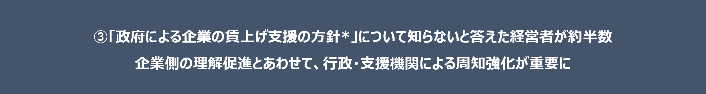 ③「政府による企業の賃上げ支援の方針*」について知らないと答えた経営者が約半数