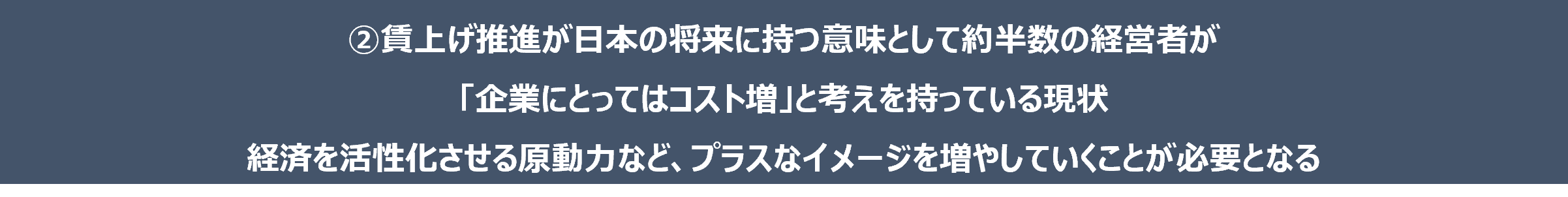 ②賃上げ推進が日本の将来に持つ意味として約半数の経営者が「企業にとってはコスト増」と考えを持っている現状