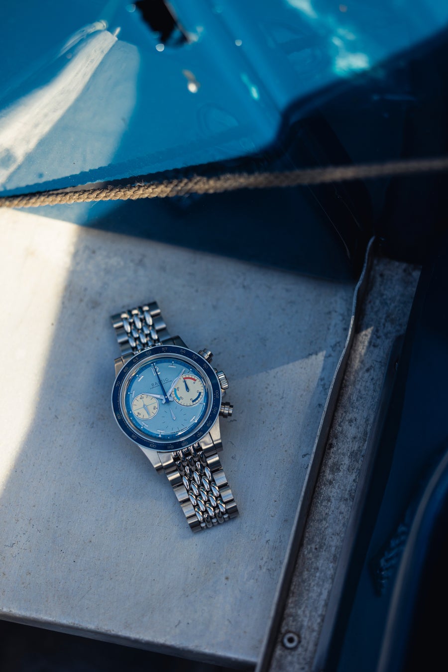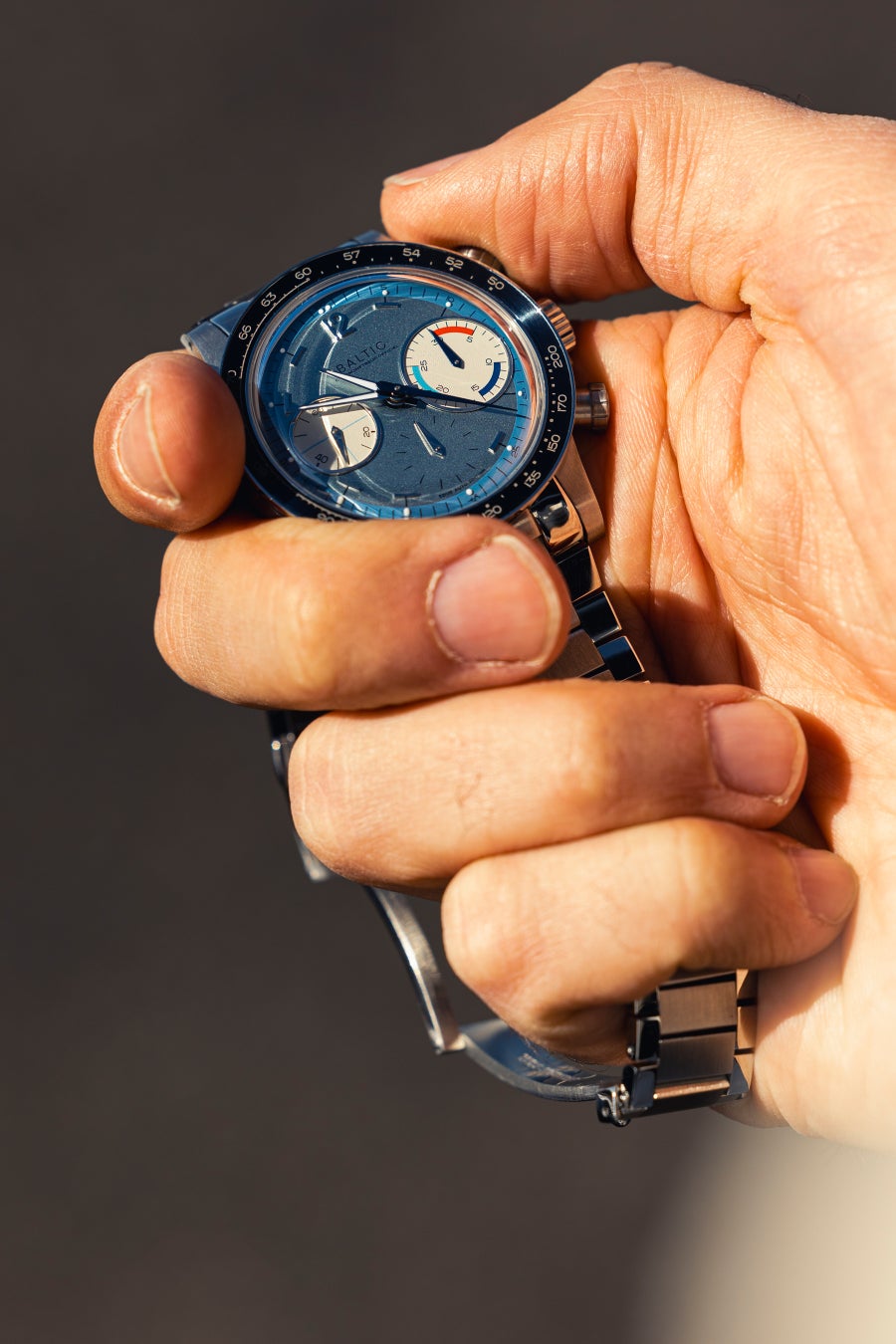 さらに、ツール・ド・フランス・オートモービルのオリジナルカラーに敬意を表し、ダイヤルにはさまざまなブルートーンを採用しました。ルミノバのドットに合わせて、文字盤に円を描くインデックスラインを追加しました。これにより、デザインがより洗練された印象になっています。