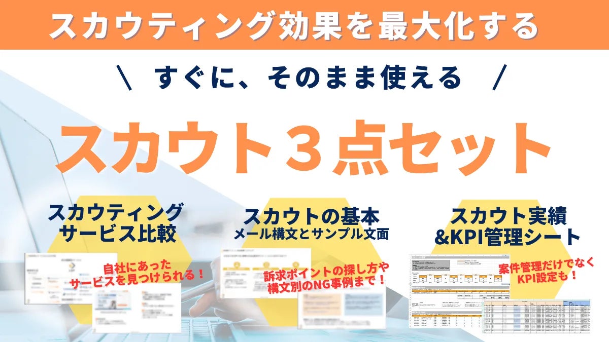 そこで、自社にあったベストな選択をできるよう、 スカウトサービス選びのポイントだけでなく、スカウトメールの書き方や数値管理シートまで、スタート〜運用のすべてがわかる資料セットをご用意しました。