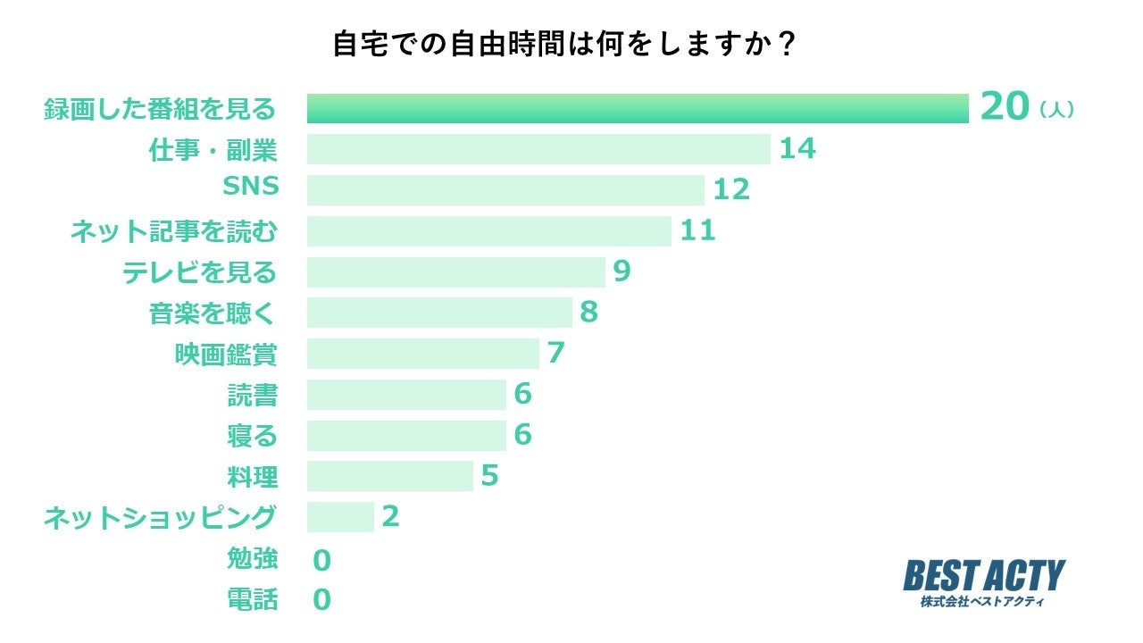 自宅での自由時間の過ごし方について100人にアンケートを行ったところ、「録画した番組を見る」と回答する人が最も多い結果となりました。