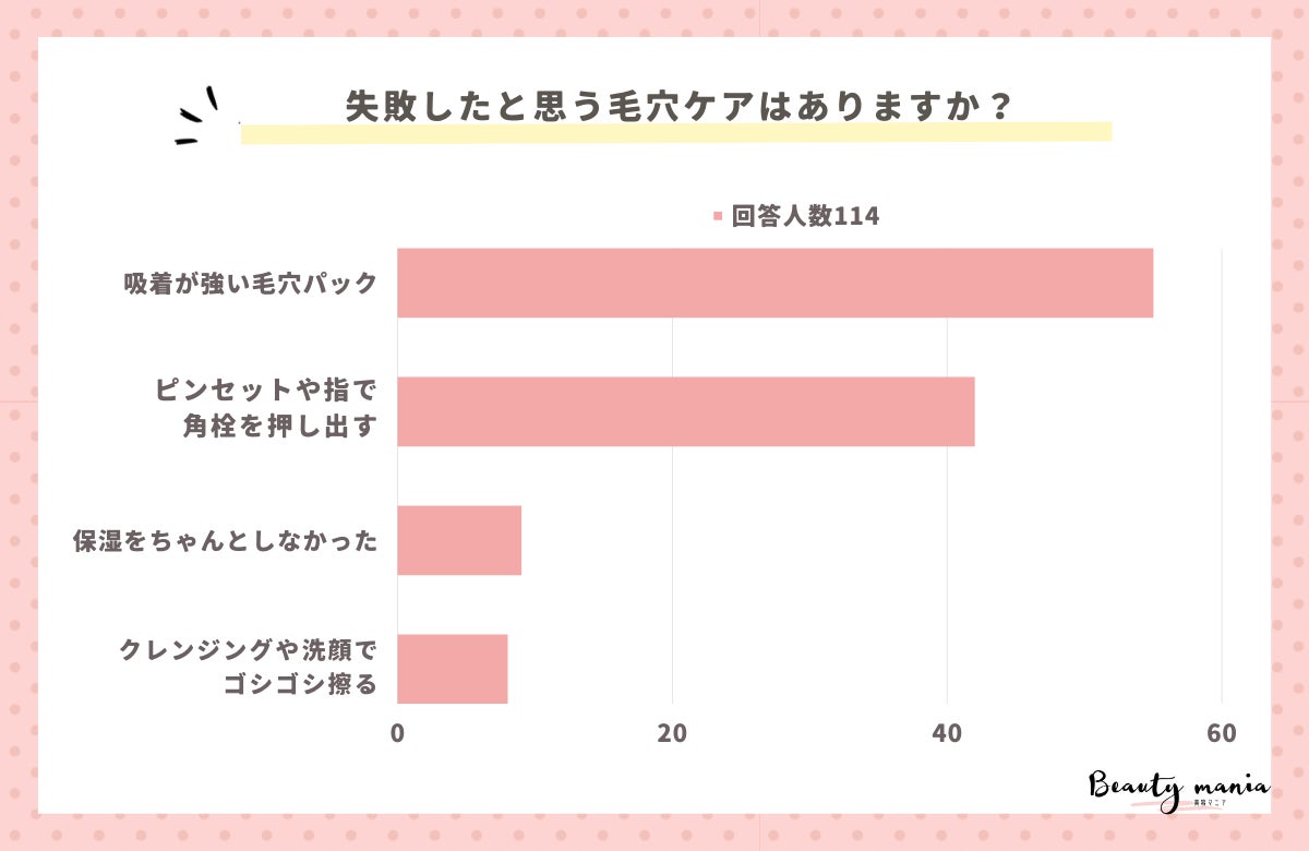 「失敗したと思う毛穴ケアはありますか?」とアンケート調査した結果、1位は『吸着が強い毛穴パック(55人)』、2位は『ピンセットや指で角栓を押し出す(42人)』、3位は『保湿をちゃんとしなかった(9人)』となっています。