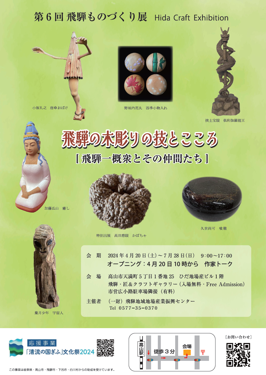 一般財団法人飛騨地域地場産業振興センターが主催の、第6回飛騨ものづくり展「飛騨の木彫りの技とこころ~飛騨一概衆とその仲間たち~」が、7月28日まで同センター1階クラフトギャラリーにて開催しています。