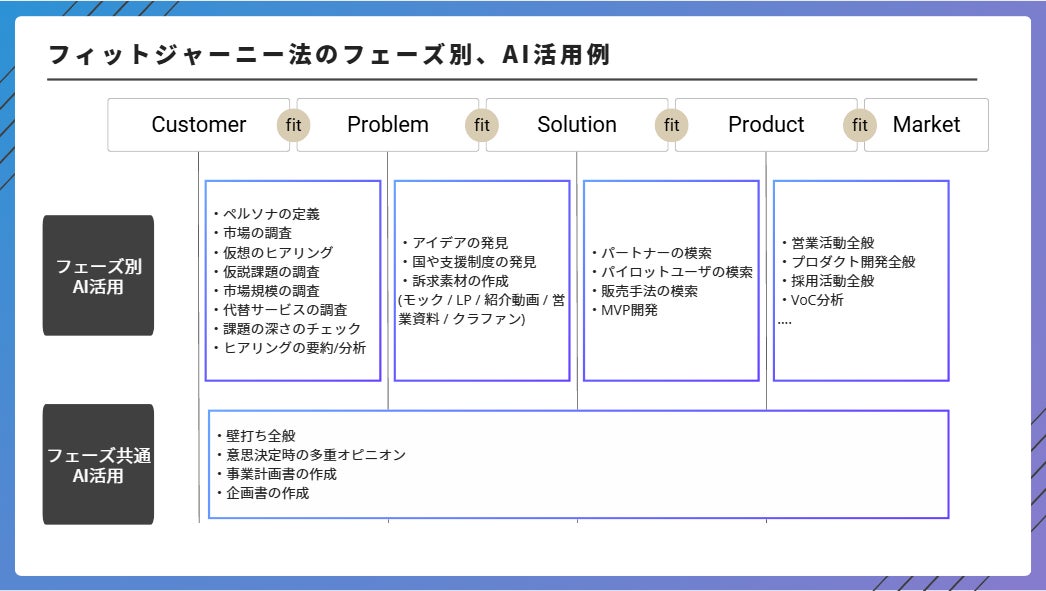 AI×新規事業の重要事項:新規事業における課題解決を「フィットジャーニー法」をベースに、各フェーズでAIが具体的にどのように活用できるかの事例とプロンプトを解説。