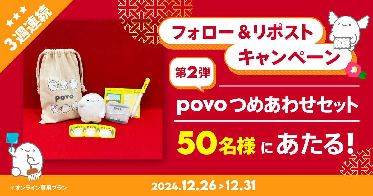 「歳末祭」では、対象トッピングのデータ容量を10%増量するほか、年末年始にゆっくり読める電子マンガ「ピッコマ」とのコラボトッピングを提供します。さらに、povoのオリジナルグッズ6点がセットになった「povoつめあわせセット」が50名にあたるpovo公式Xリポストキャンペーンも実施します。