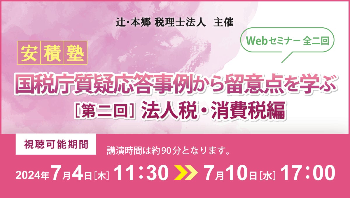辻・本郷 税理士法人(本社:東京都新宿区、理事長:徳田孝司)は、2024年7月4日(木)より「【安積塾】第二回 国税庁質疑応答事例から留意点を学ぶ~法人税・消費税編~(全二回)」セミナーを開催いたします。第二回となる今回は、令和5年11月に更新された国税庁質疑応答事例より、法人税及び消費税を中心に解説します。留意点を確認したい方にお勧めのセミナーです。