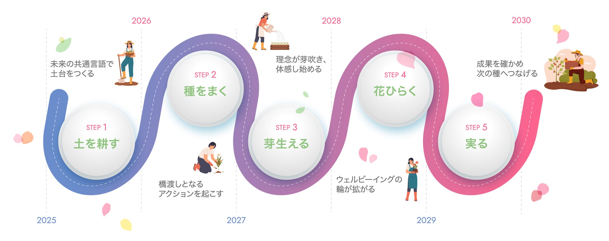 土を耕す(2025年度) 芽生え、花ひらき、実らせる(2027~2030年度): 2030年を一つの節目とし、社内外のパートナー企業や地域社会と手を取り合い、ウェルビーイングの輪を無限大に広げていきます。 |