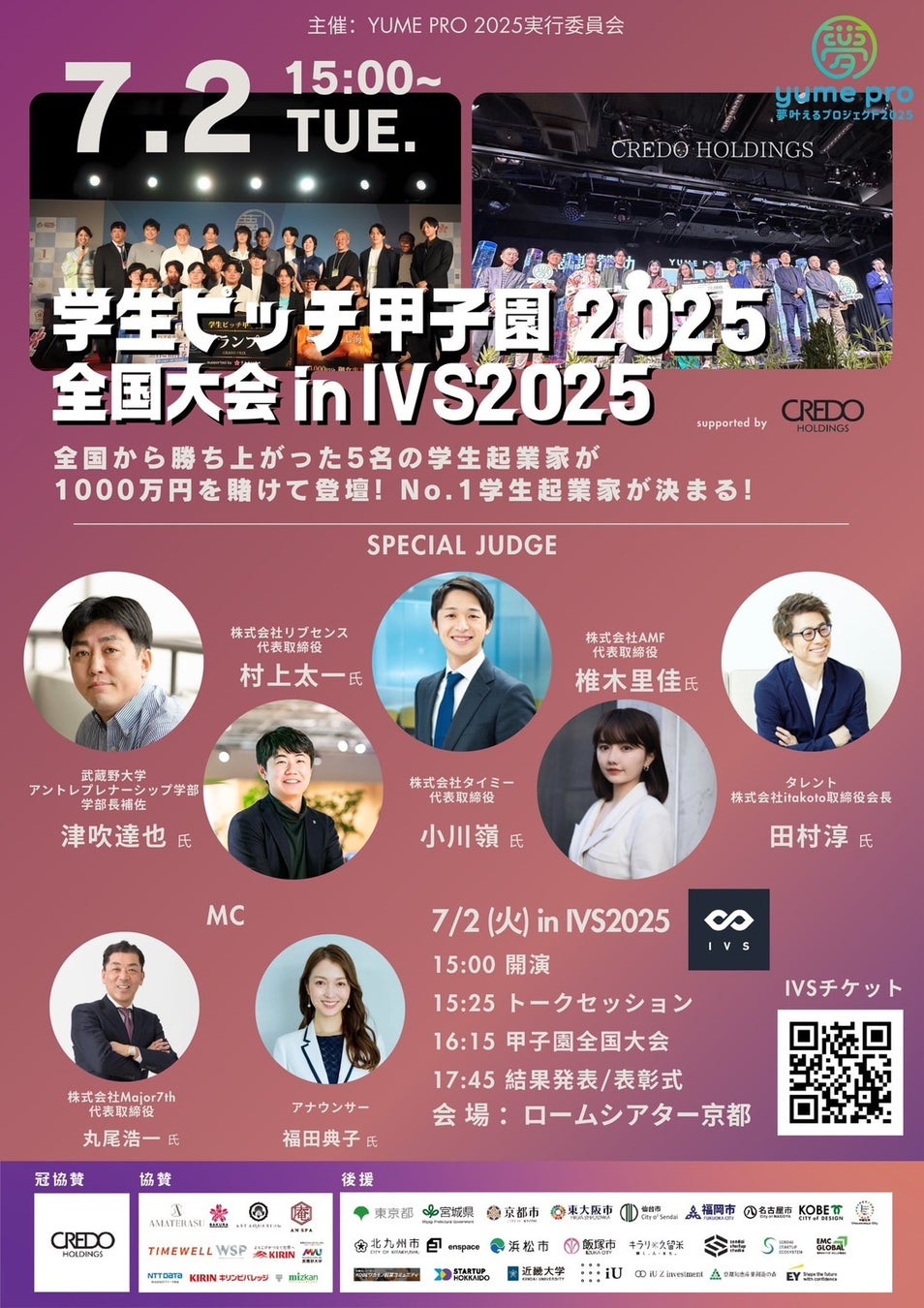 全国の学生起業家が集い、未来のビジネスリーダーを目指す登竜門「学生ピッチ甲子園2025」の決勝大会が、2025年7月2日(水)、日本最大級のスタートアップカンファレンス「IVS2025 KYOTO」にて開催されることが決定しました。