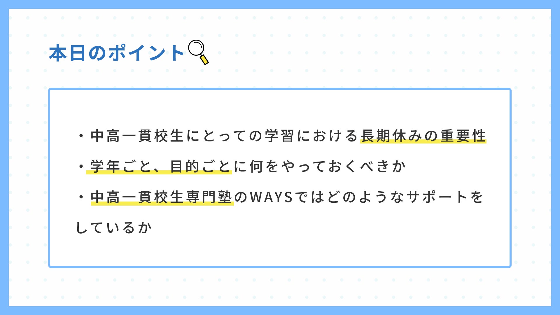 こうした「冬の後悔」を未然に防ぎ、有意義な長期休暇にしていただくため、ご家庭でも実践できる学習の指針を示す本セミナーを企画いたしました。