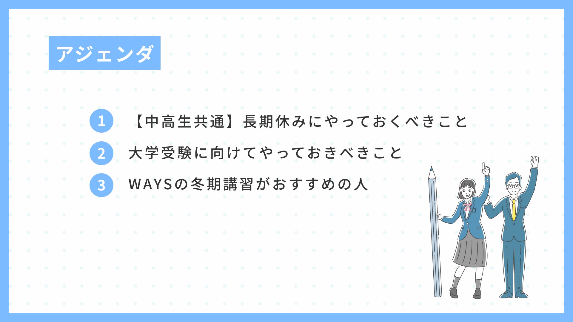 本セミナーでは、WAYSのマネージャー佐藤聖一が登壇。豊富な指導データに基づき、学年や成績状況に応じた「冬にやるべきこと」を明確にします。ただの精神論ではなく、大学受験から逆算した戦略的な学習計画の立て方や、WAYSの冬期講習がどのように「解きっぱなし」を防いでいるかについても解説します。