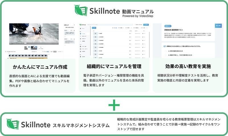 これに伴い、Skillnoteは2026年1月20日より動画マニュアル作成・管理サービス「Skillnote 動画マニュアル Powered by VideoStep」の提供を開始します。本サービスは、VideoStepの動画マニュアル基盤をOEMとして活用し、Skillnoteが提供するサービスです。動画を活用した教育の実施と定着を支援します。既存の「Skillnoteスキルマネジメントシステム」と併用することで、製造現場における教育計画の策定から動画を活用した教育実施、教育の記録までを包括的な支援が可能になります。