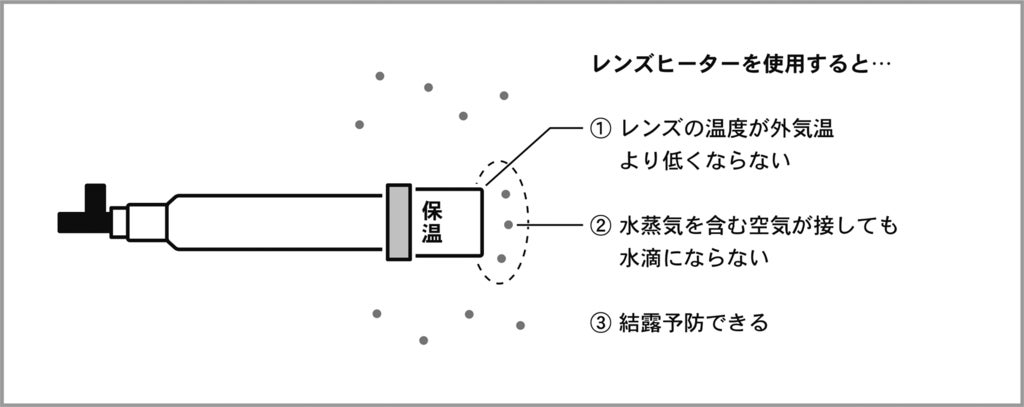 レンズヒーター380-12Vでレンズの温度が気温より低くならならないよう保温することで結露を効率的に予防します。