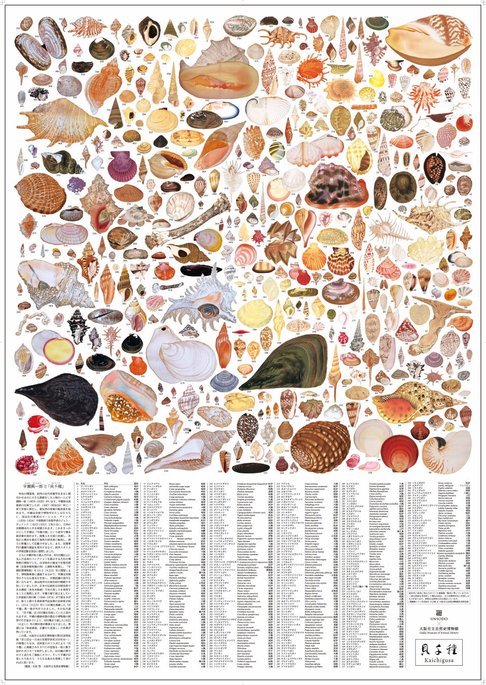 「貝千種」に掲載された全400種の貝を一枚に敷き詰めたポスターです。下部には全400種の貝の種名、学名、産地の情報を記載しています。「貝千種」の華やかさと迫力を、ぜひご自宅でもお楽しみください。