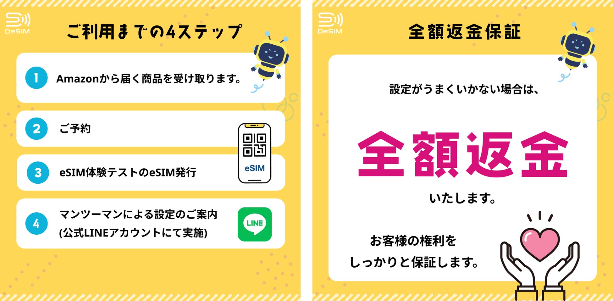 安心の全額返金保証:万が一、お客様の端末でeSIMがご利用いただけない場合、全額返金いたします。
