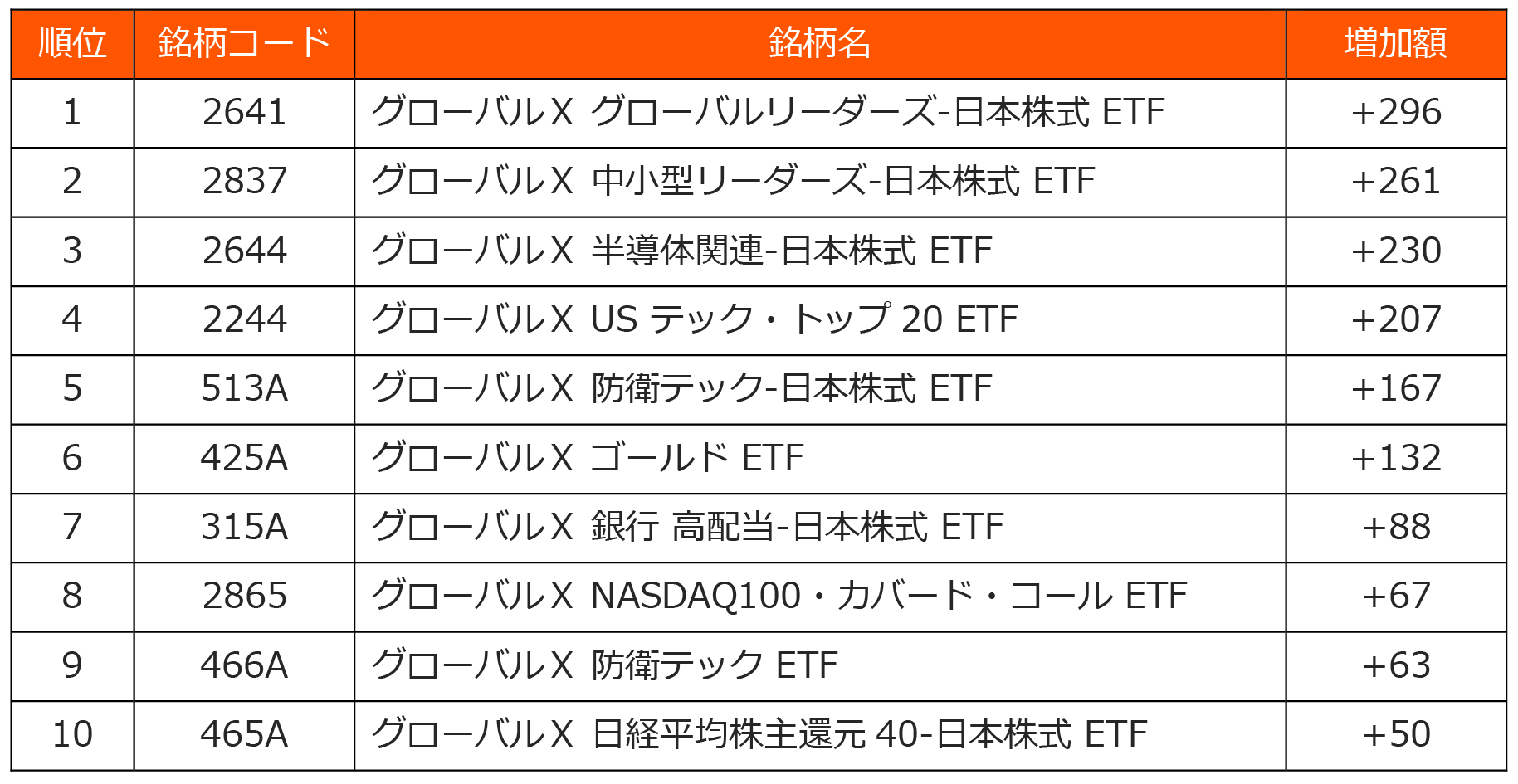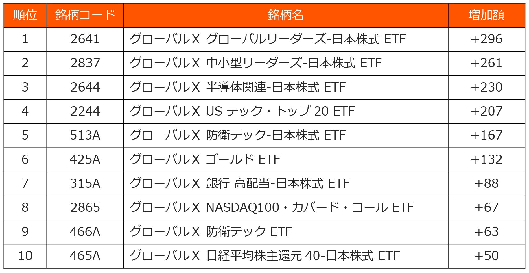国際情勢の不確実性を背景に株式市場には不透明感が広がっていますが、当社ETFの中では、機関投資家からは「グローバルX グローバルリーダーズ-日本株式 ETF」(銘柄コード:2641)や「グローバルX中小型リーダーズ-日本株式 ETF」(銘柄コード:2837)等のコア銘柄に資金が流入する一方、個人投資家を中心に「グローバルX ゴールドETF」(銘柄コード:425A)、「グローバルX 防衛テック ETF」(銘柄コード:466A)、「グローバルX 防衛テック-日本株式 ETF」(銘柄コード:513A)等、インフレや地政学的リスクに関連する商品への資金流入が拡大しています。