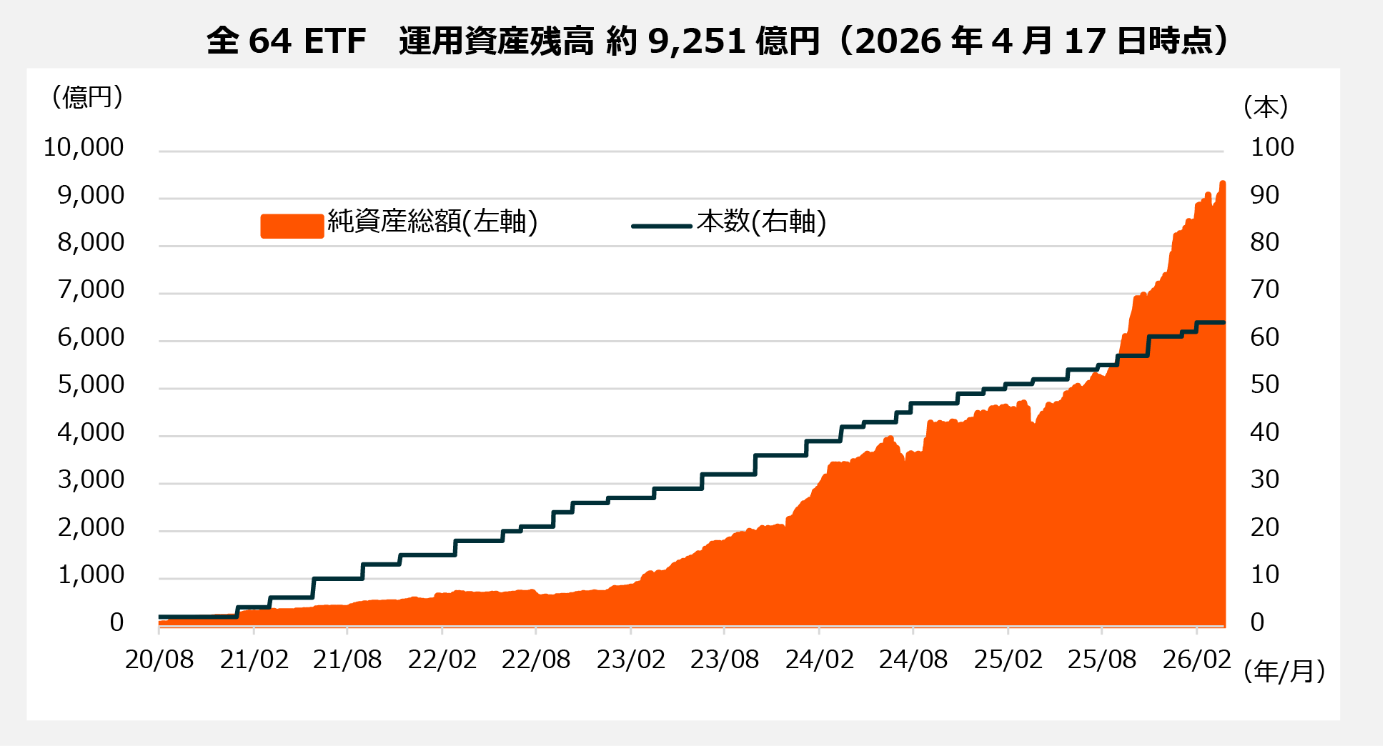 投資家の皆さまの多様なニーズに応えるべく、成長テーマ型、インカム型、コア型、コモディティ型など、多岐にわたる革新的なETFラインアップを揃えており、上場銘柄数も本日時点で66本まで拡大しています。