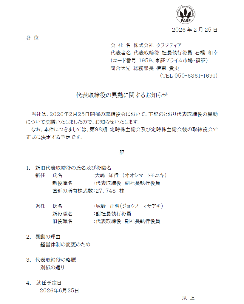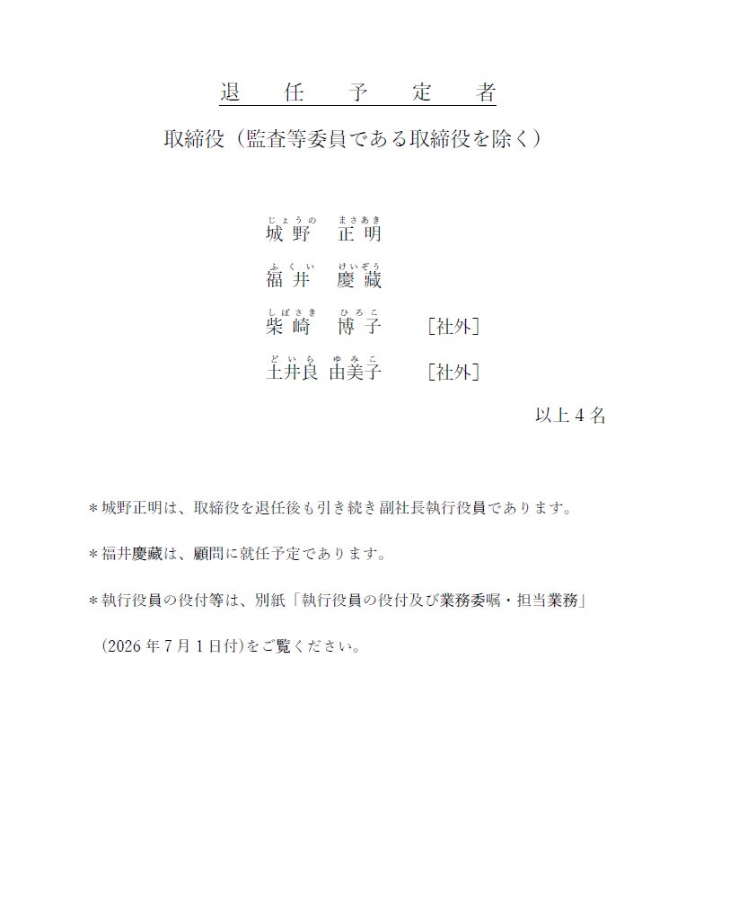 当社は、2026年2月25日開催の取締役会において、下記のとおり、取締役の異動について決議いたしましたので、お知らせいたします。