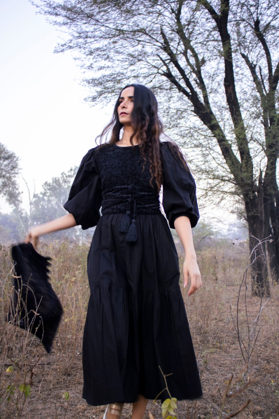 印象的なパフスリーブに、少しハリ感のあるコットンの3段ティアードロングスカートはシーンを問わず活躍すること間違いなし。