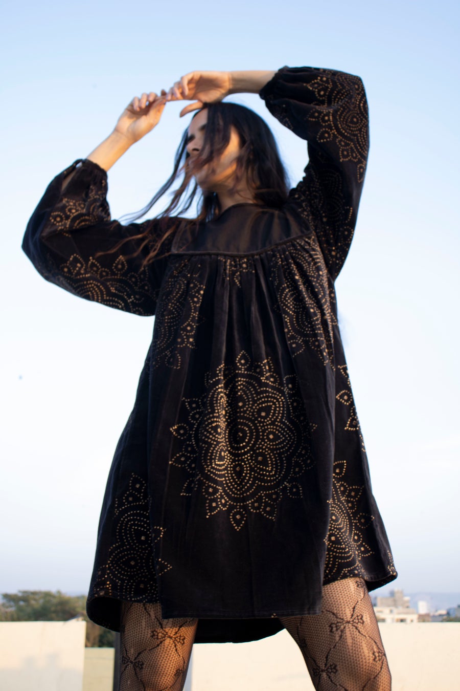 ラグジュアリーなベルベット生地に繊細なゴールドのブロックプリントを施し、FWシーズンぴったりのドレスに仕上げました。