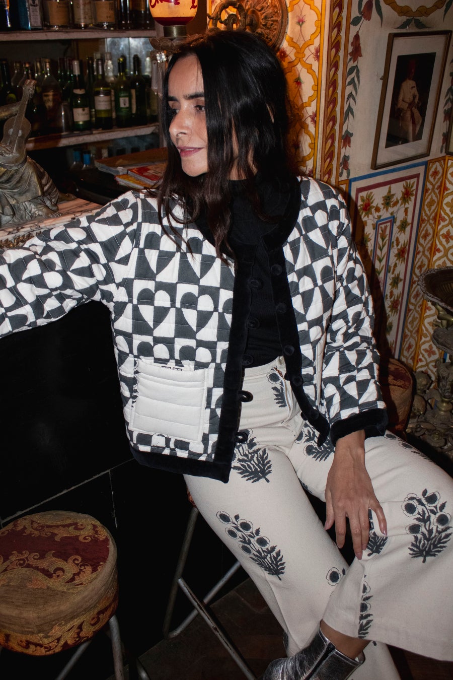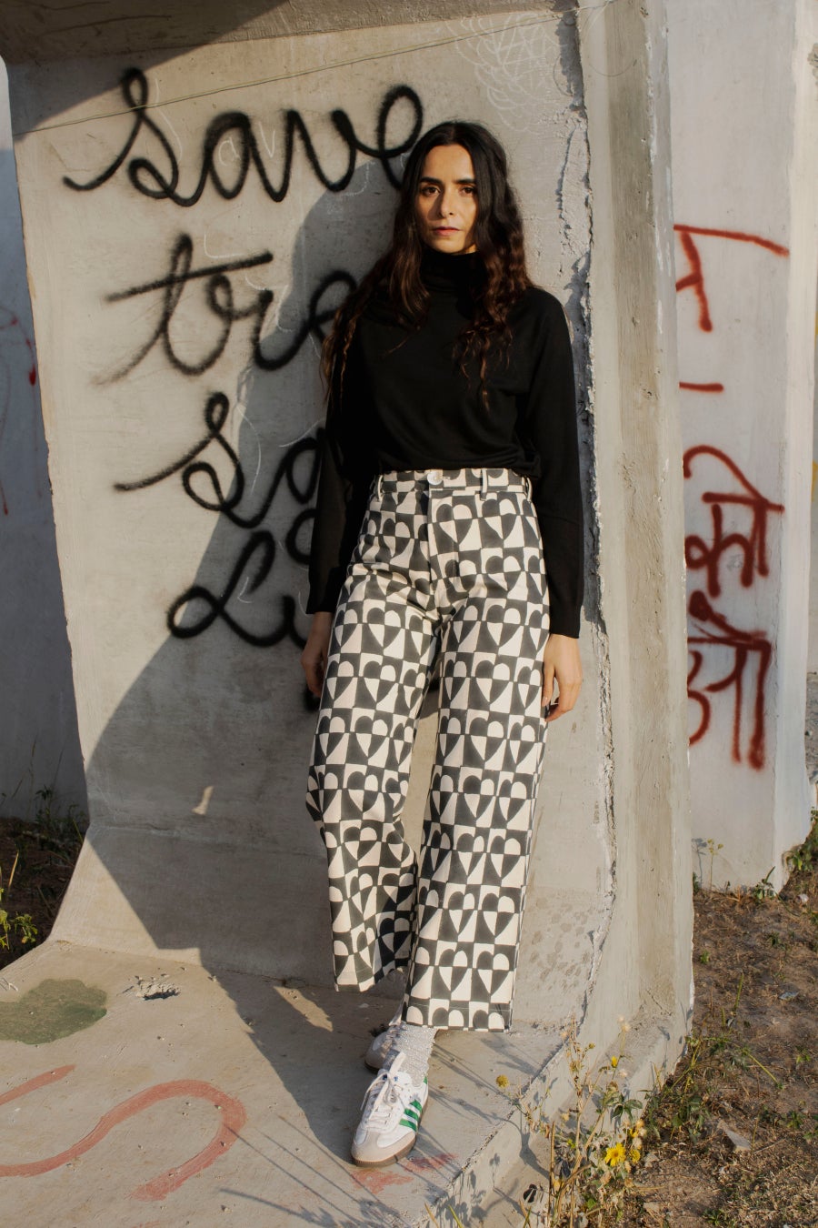 新しいハート型のクッキープリントをあしらいました。ディスコパンツはウエストとヒップを包み込んでくれるハイウエストシルエットが特徴。無染色のアイボリーのデニムパンツに映えるノスタルジックなブロックプリントはこなれた雰囲気をまとわせてくれる1本。