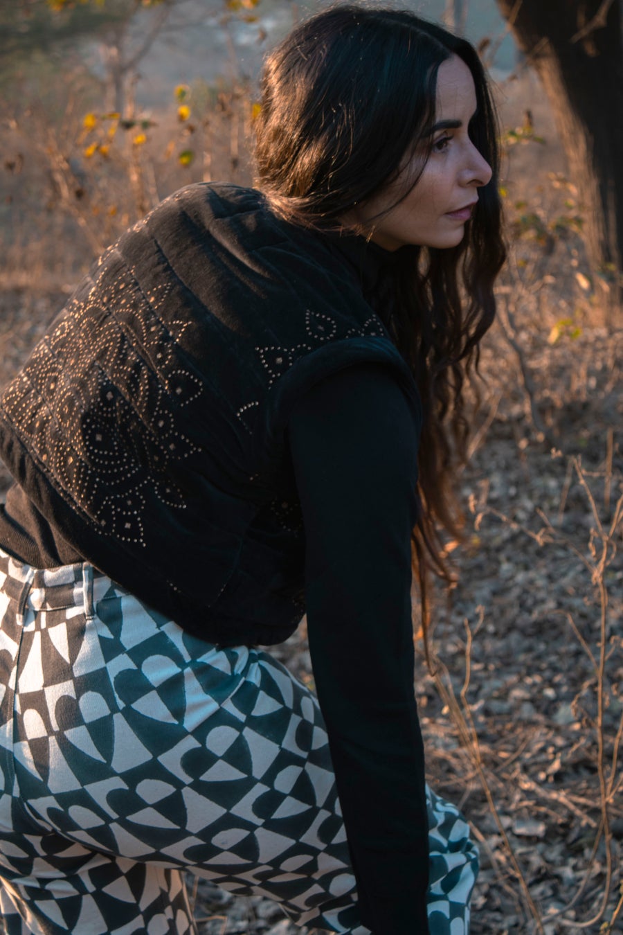 今回のコレクションは上質なベルベット生地を採用し、温かみのある素材に職人が手作業で施すブロックプリントが美しく映え、クラシックでありながらモダンなデザインが特徴です。ラインナップにはワンピース、ジャケット、新型のベストなど毎日着たくなるようなピースが揃います。ジャケットとベストに施されたプクッと愛らしいベルベット調のくるみボタンは、デザイナーのサラこだわりそのもの。