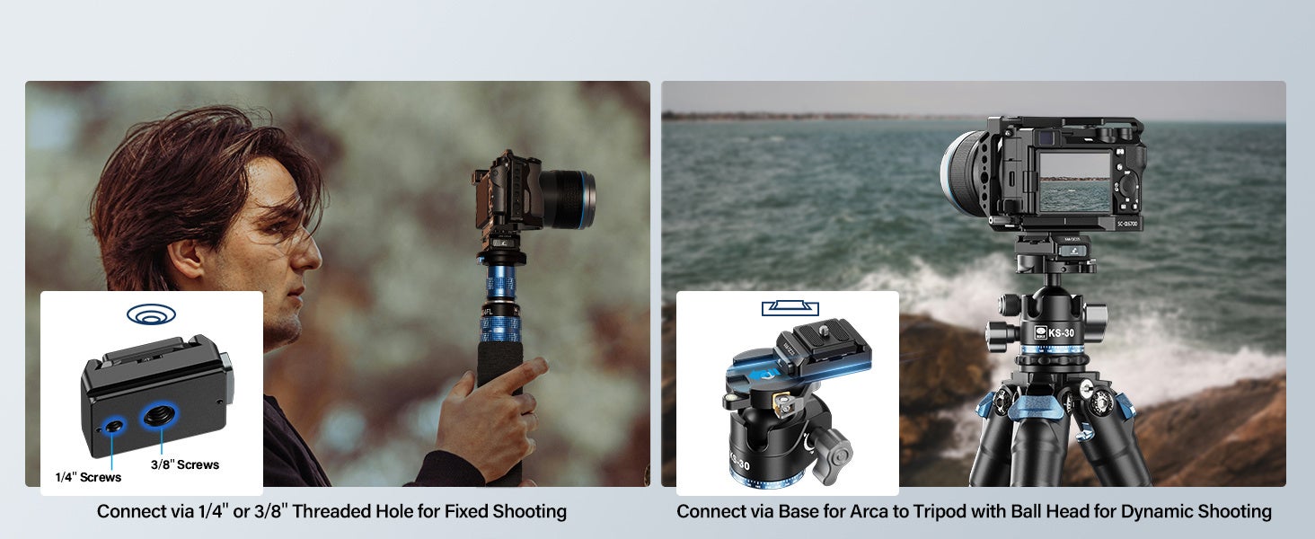 カメラベースプレートの底部には1/4インチおよび3/8インチのネジ穴があり、ベース全体がArcaタイプのクランプと互換性を持っています。これにより、ベースプレートを三脚、一脚、その他のアクセサリーにしっかりと取り付けることができ、さまざまな撮影シーンに対応可能です。