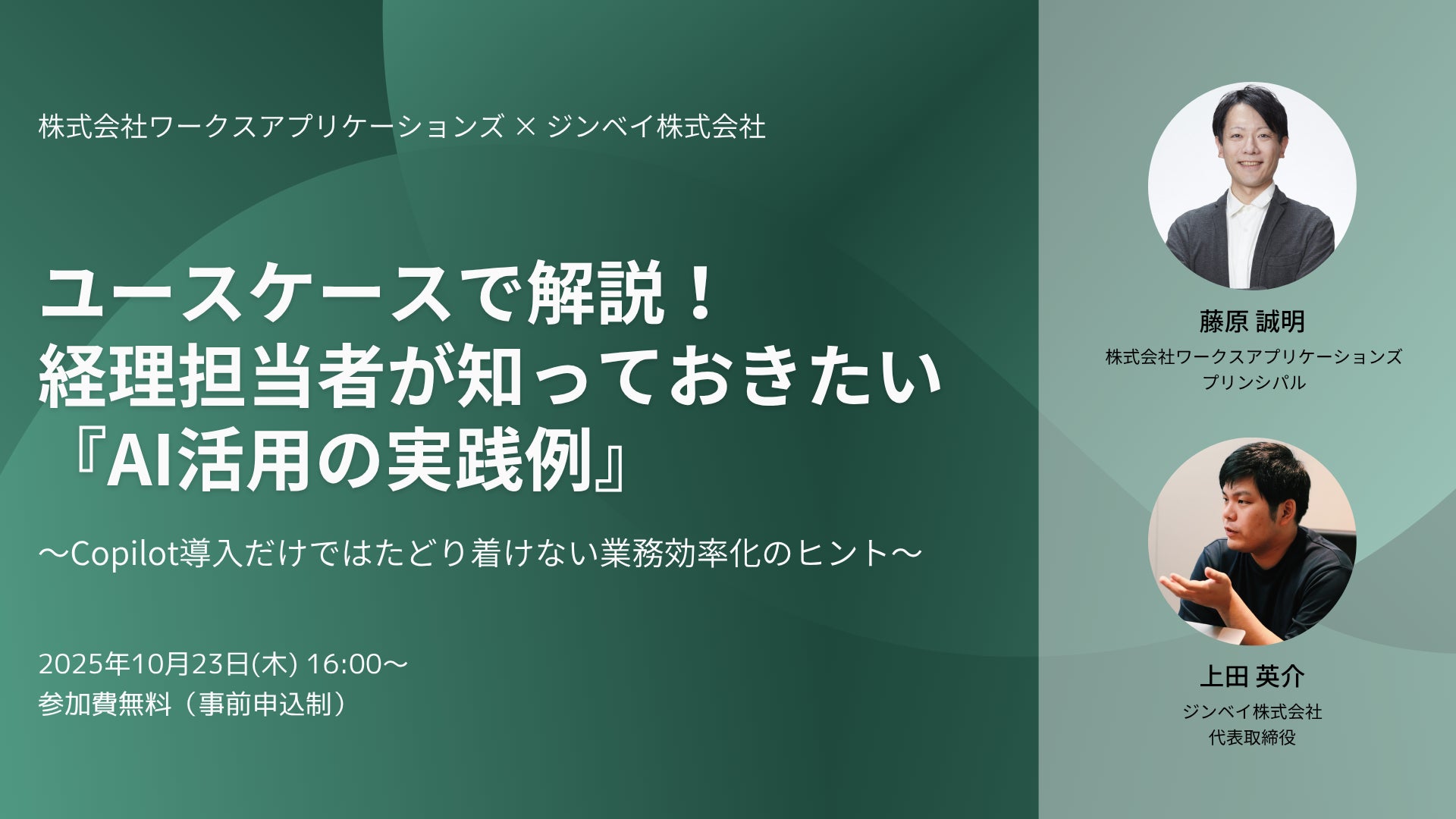 株式会社ワークスアプリケーションズとの共催で、「経理担当者様が知っておきたい『AI活用の実践例』」をテーマとしたウェビナーを、2025年10月23日(木)16:00より開催いたします