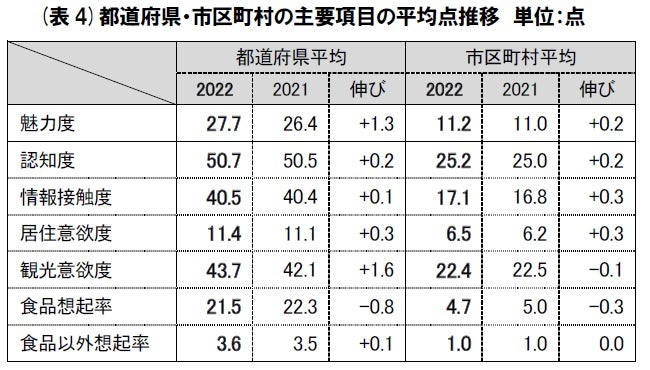 主要指標の中で最も大きく伸びたのは都道府県では観光意欲度で43.7点と前年より1.6点の伸び。ところが、市区町村では22.4点となり、前年より0.1点の減少となった。食品想起率は都道府県、市区町村ともに平均点が低下している。