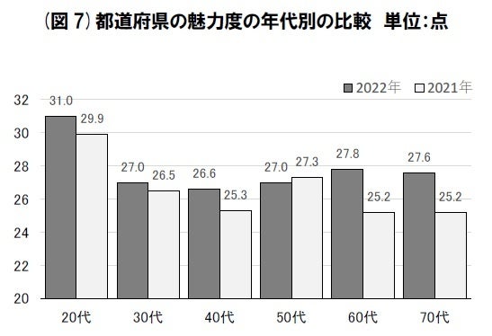 図7は、回答者の年代別に47都道府県の魅力度の平均を比べたもの。20代が最も魅力度の平均点が高くなっているが、次いで60代と70代となっており、それぞれ前年より大きく上昇している。なお、市区町村の結果においても同様の結果が得られた。