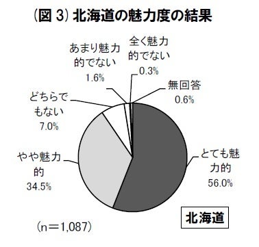 回答者の56.0%が「とても魅力的」、34.5%が「やや魅力的」と、合計で9割以上が北海道を「魅力的」と回答した。観光意欲度、食品想起率、食品以外想起率でも1位となったほか、居住意欲度も2位と、あらゆる面で高い評価を得ている。