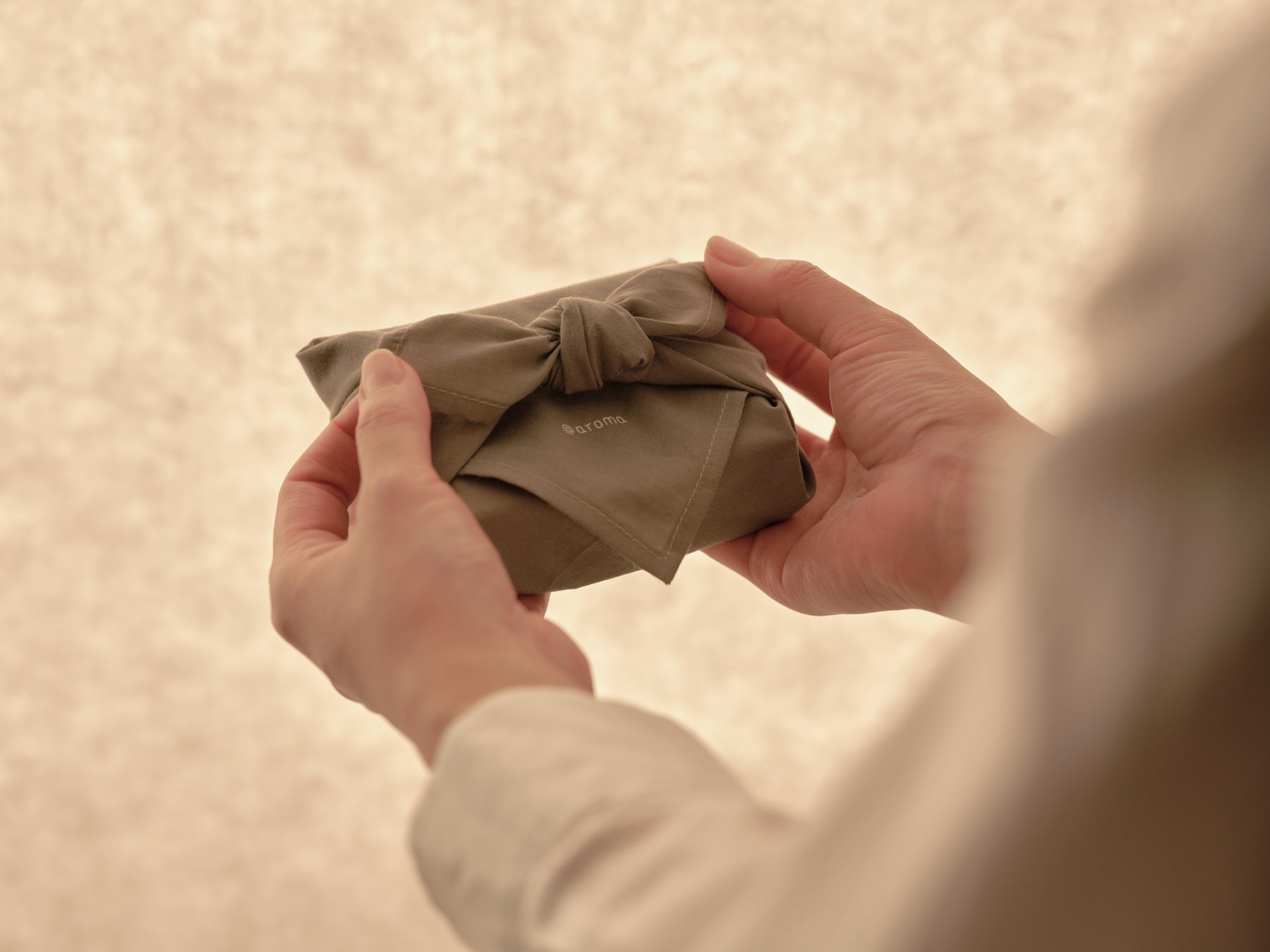 ラッピングには日本文化を背景にした風呂敷を採用し、未活用食材を再利用し染めたサステナブルな生地を使用しています。豊かな自然や日本らしさを感じながらゆったりと過ごす、上質なやすらぎを感じられるギフトです。