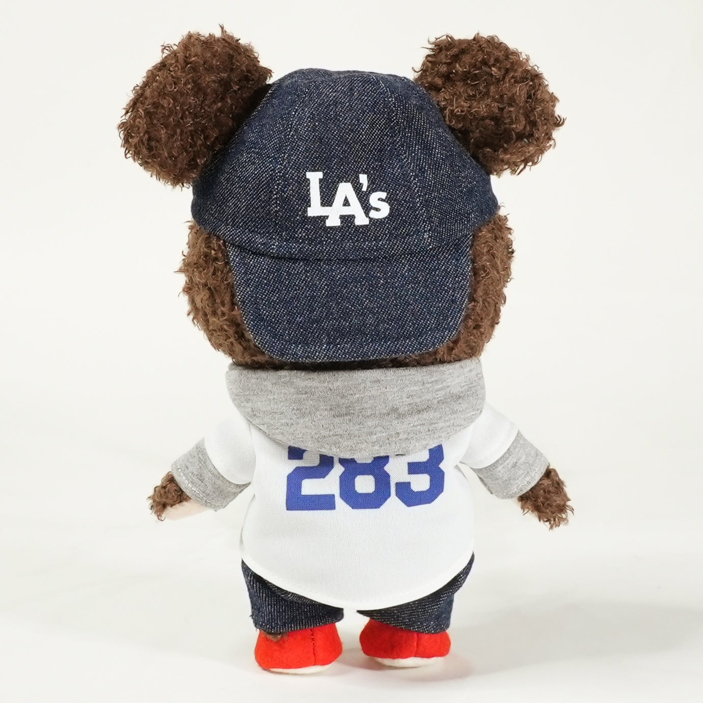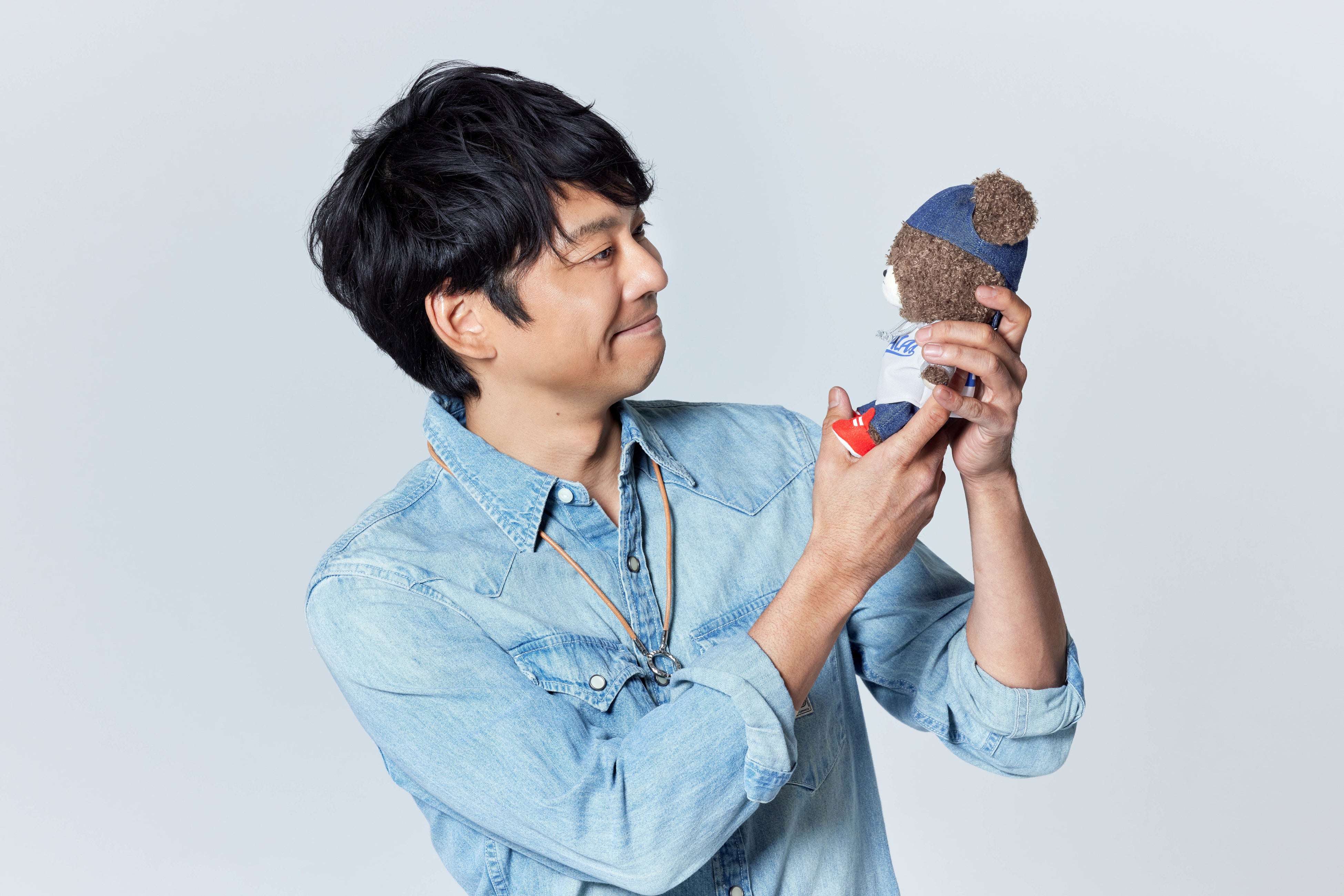 デニムに赤いスニーカー、パーカーの上にユニフォームを羽織る、というスタイルは僕が普段野球観戦をするときの定番コーデなので、それをそのまま再現しつつ、よりポップなジャッキーに仕上げました。皆さんにも楽しんでいただければと思います。