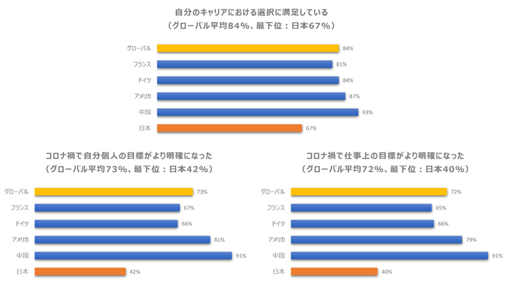 調査結果によると、世界の労働者の多くが自身のキャリアの選択に満足している一方で、日本の労働者の満足度は最も低くなっています。コロナ禍で自分のキャリアについて考える時間は増加し、自分個人の目標がより明確になった労働者は半数近くいるものの、グローバル平均と比較すると、日本の労働者はコロナ禍における仕事やキャリア選択に対しての満足度が低いことが本調査結果より明らかになりましたった。