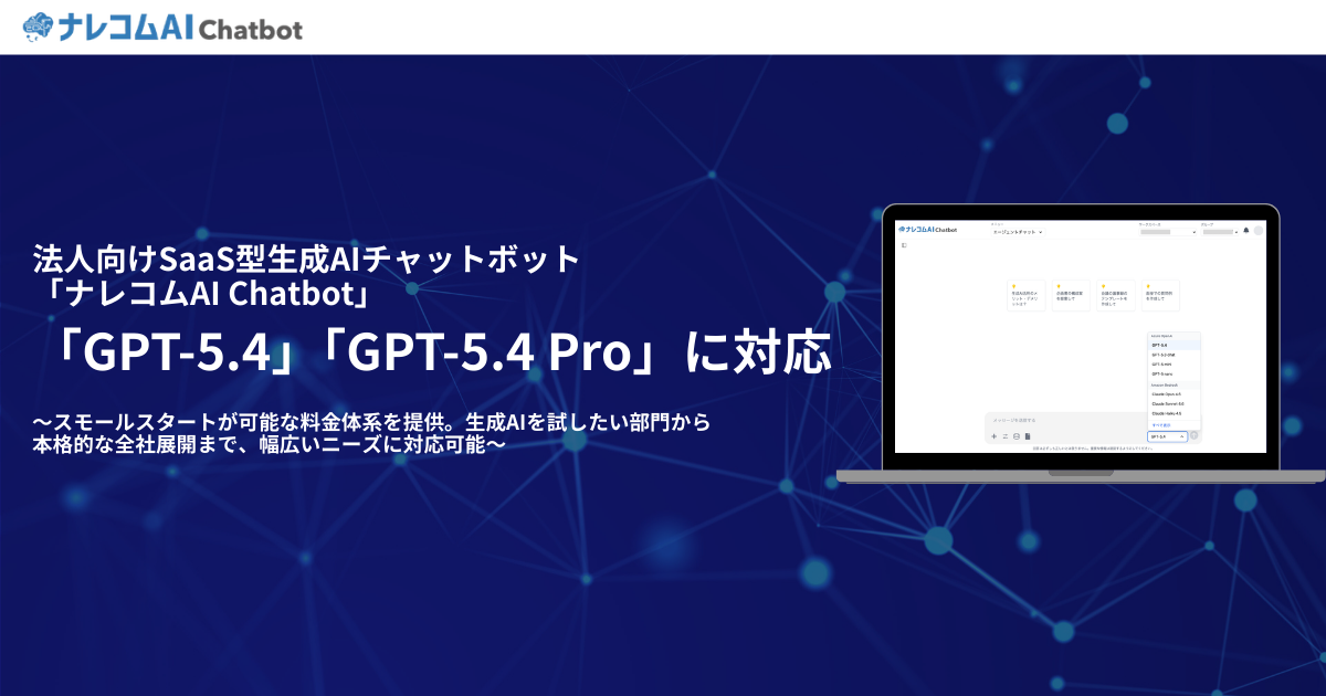 株式会社ナレッジコミュニケーション(本社:千葉県市川市、代表取締役:奥沢 明、以下「ナレッジコミュニケーション」)は、法人向けSaaS型生成AI活用プラットフォーム「ナレコムAI Chatbot」において、OpenAI最新モデル「GPT-5.4」「GPT-5.4 Pro」に対応したことをお知らせします。