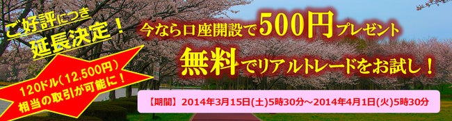 2014年4月16日(水)5時30分までに初回ログインをされたお客様全員に500円をご入金させて頂きます。