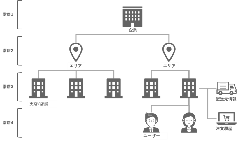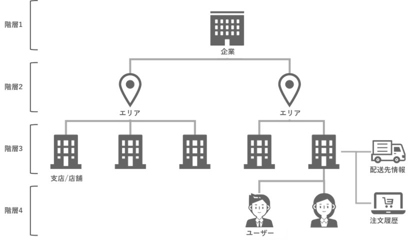 EC-Rider B2B IIは、構築パッケージから必要な機能だけを選び、業界の商習慣や顧客企業の既存業務フロー、基幹システムとの連携等、自由度の高いカスタマイズでセミオーダー式のサイト構築が可能です。今回のバージョンアップでは、クライアントから要望の多い機能を標準装備し、設定等の拡張性を高めました。例えば、企業間取引では発注者(バイヤー)は個人でなく法人であることから、法人に複数担当者(ユーザー)を所属させることは可能でしたが、EC-Rider B2B IIではより企業間取引の現実に近い法人管理形態として各階層での管理を可能としました(図参照)。また、最新のサイバー攻撃に対する備えとしてISMAP*2対応インフラを採用しており、従来はオプションだったWAF*3を標準搭載しています。強固なセキュリティで安全・安心な利用環境を提供し、顧客企業のリスク低減に貢献します。