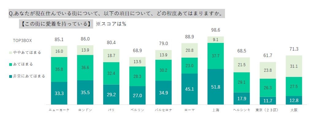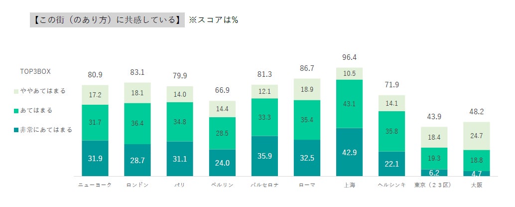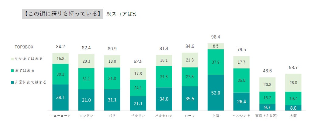 「愛着」「共感」「誇り」のいずれも「上海」が最も高い評価となった。「愛着」と「共感」では「ローマ」「ロンドン」が、「誇り」では「ローマ」「ニューヨーク」が次いで高い評価となった。日本の2都市については「大阪」が「愛着」で「ヘルシンキ」「ベルリン」を上回る評価となった。一方「東京」はいずれの項目も最も低い評価となった。