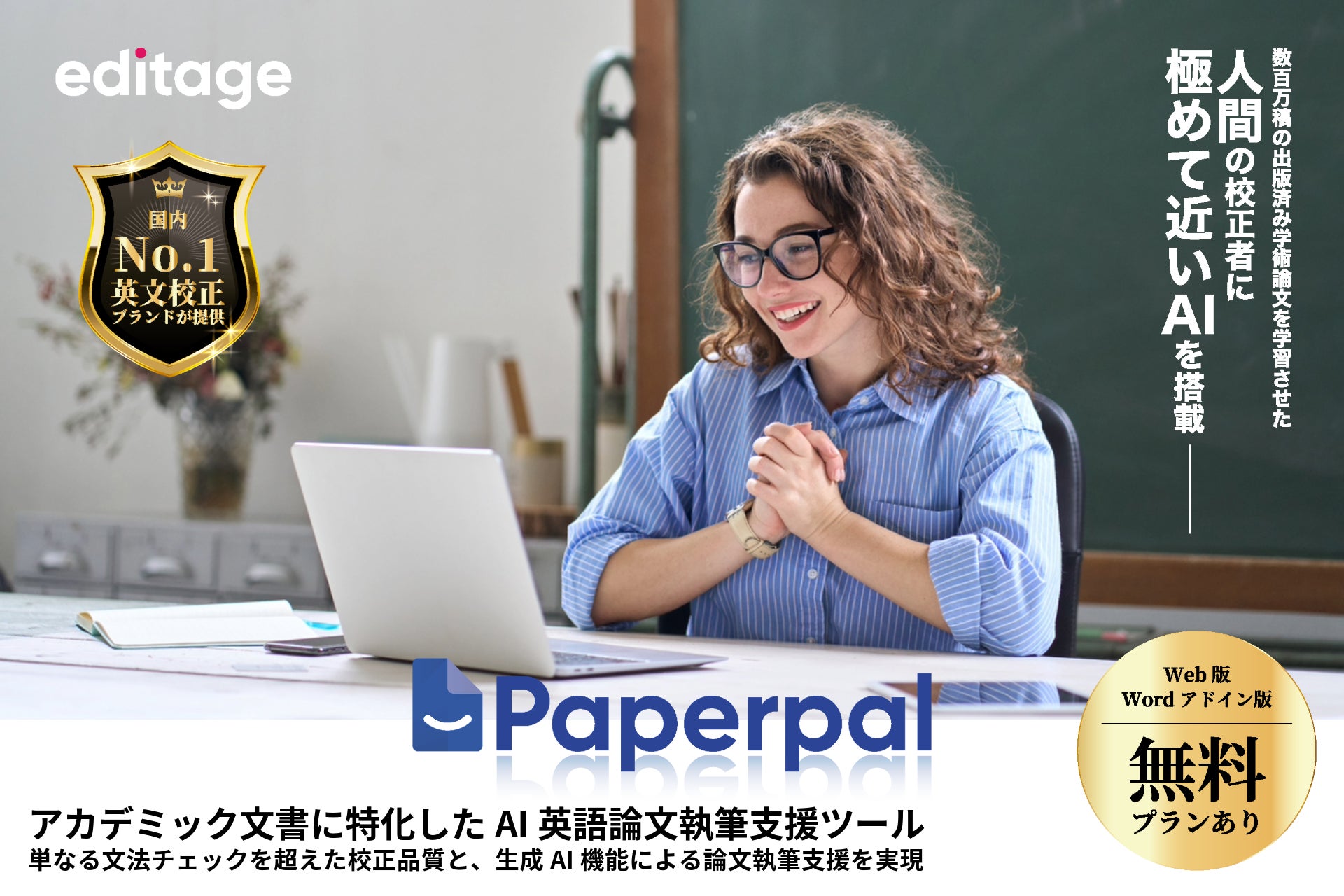 AI英語論文執筆支援ツールPaperpalは、科学コミュニケーションとテクノロジー企業であるカクタス・コミュニケーションズ (https://cactusglobal.com/jp/)が提供するサービスブランドです。Paperpalに使われるAI技術は、出版された論文の学習に加え、20年以上に渡って英文校正ブランドであるエディテージの熟練の学術校正者が蓄積してきた校正ノウハウを学習させることにより作られています。Paperpalを利用することで、プロ校正者の英文チェックに極めて近い、正確で文脈に合った英語表現の提案や、AIによる単語削減、書き換えなどのサポートをリアルタイムで得ることができます。