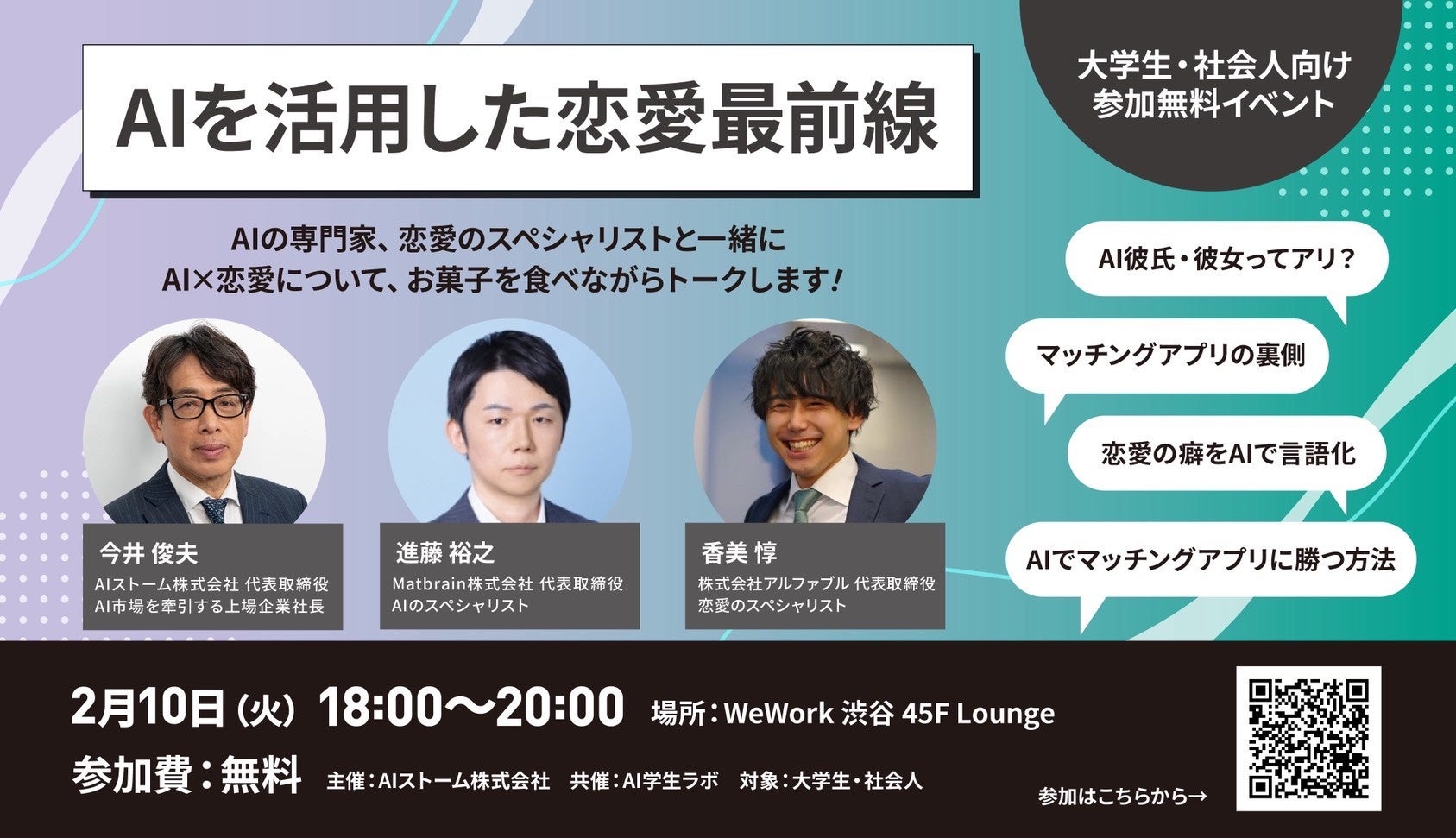 AIストーム株式会社(旧株式会社ジェクシード、本社:東京都千代田区、代表取締役社長 今井俊夫、証券コード:3719)は、2026年2月10日(火)、WeWork 渋谷スクランブルスクエア45Fラウンジにて、「AIを活用した恋愛最前線」をテーマとしたトークセッションイベントを開催しました。