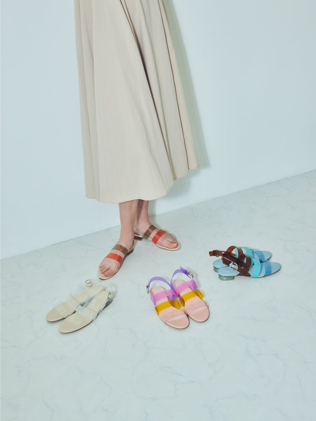 クリア×マルチカラーのフラットサンダル。POTETEの代表アイテム「オーガンジービッグシュシュ」のようなシアー感がスタイリングに抜け感を出してくれます。