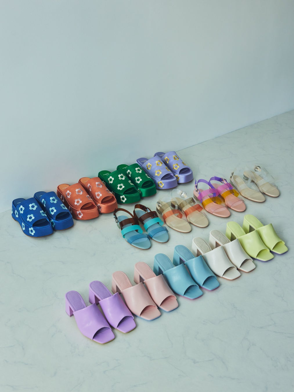 ペールトーンが目を引くサンダルは、ソールとのカラー配色で遊び心のあるデザインに。歩くたびに見えるソールのカラーがアクセントになります。