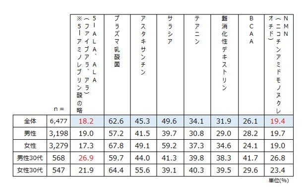 「Q.健康や美容をサポートする成分についてそれぞれどの程度ご存じか当てはまるものを一つお知らせください。」と質問した結果、5-ALAの認知度は全体で18.2%でした。これは最近、エイジングケア成分として話題のNMN(ニコチンアミドモノヌクレオチド)と同等の認知度です。その中でも認知度が高い性年代は30代男性で全体の26.9%を占めていました。