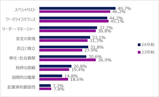 また、学生がキャリアで重視する要素として、今年夏期に実施した調査に引き続き、スペシャリストとなることを重視する傾向が続いています。要因としては、ジョブ型雇用が導入されつつある中で、キャリアにおけるスキルや専門性を重視する傾向が強まっている事が考えられます。
