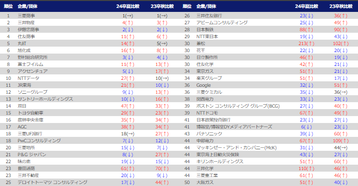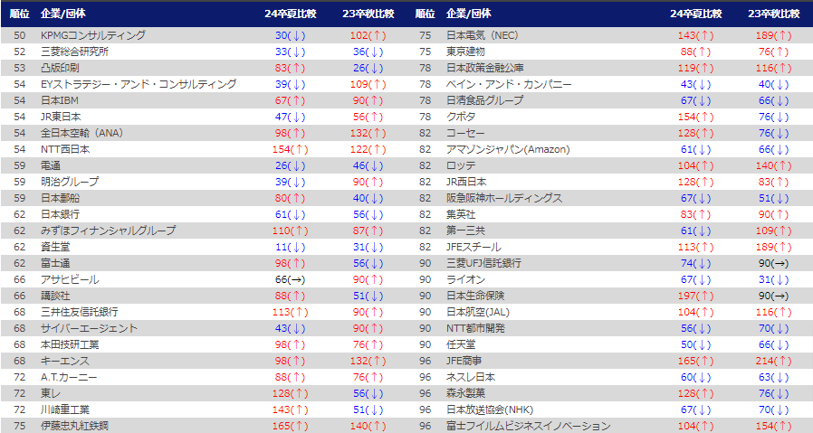 IT/通信業界の平均順位も今年夏期と比較し、上がりました。例えば、NTTデータ(27位→11位)、NTT東日本(88位→28位)、NTT西日本(154位→60位)、楽天(51位→28位)、富士通(98位→84位)、NEC(143位→88位)等です。