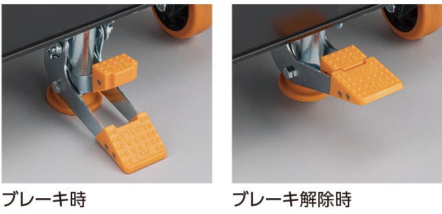 ブレーキの設定・解除はブレーキを踏み込むだけで簡単に可能。大型のタイヤでもしっかり本体を固定することができます。