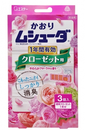「かおりムシューダ」は、洗いたてのような清潔感のある香りが収納空間内に広がりふわっとやさしく香る、香りつき防虫剤です。“引き出し・衣装ケース用”“クローゼット用” “洋服ダンス用”にそれぞれ清潔感のある〈やわらかフローラルの香り〉、〈マイルドソープの香り〉、〈フレッシュグリーンの香り〉の3種類の香りを展開しています。また、包む・巻く・かぶせるなど、自由自在に使える「かおりムシューダ香りで包むシート」もラインナップしています。