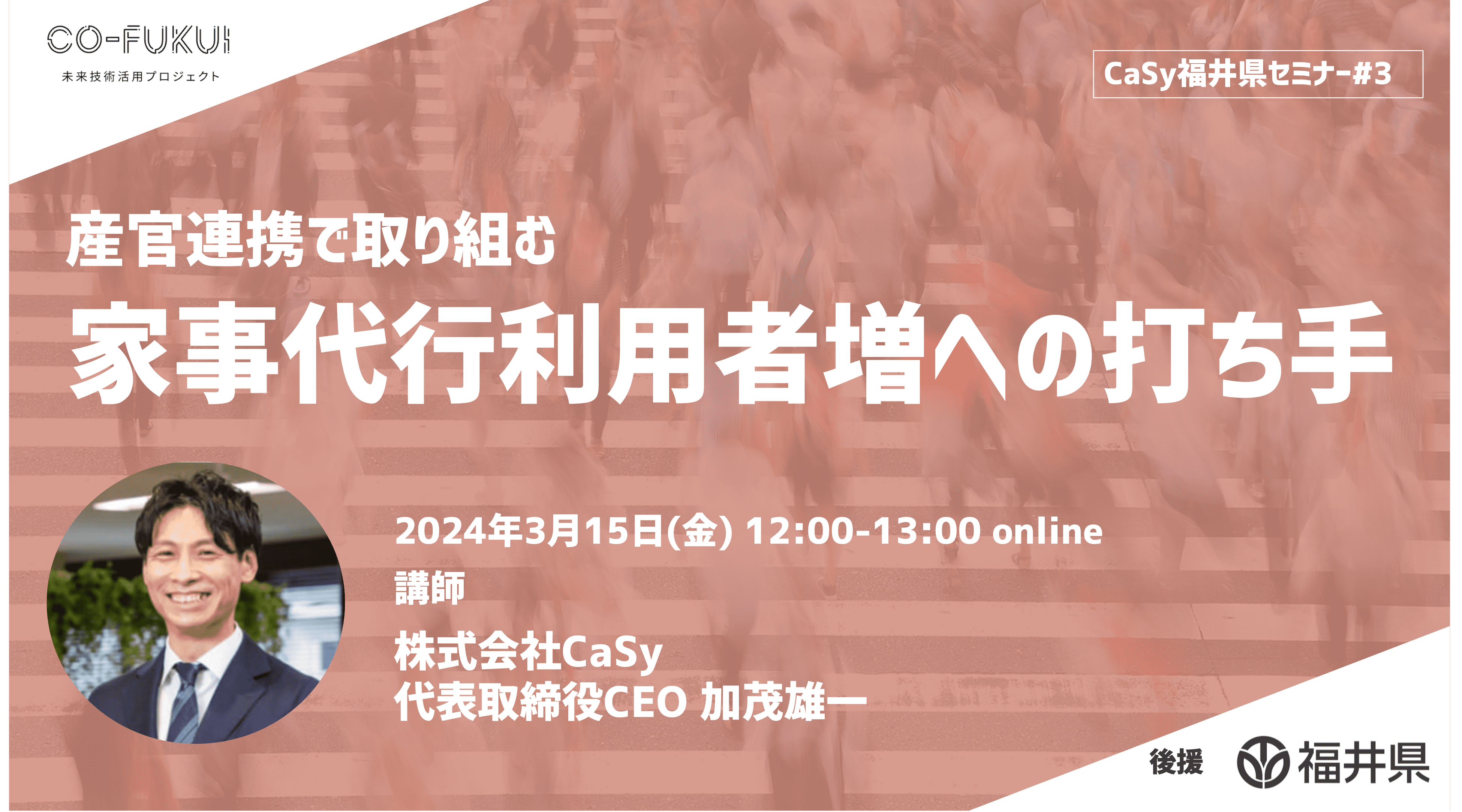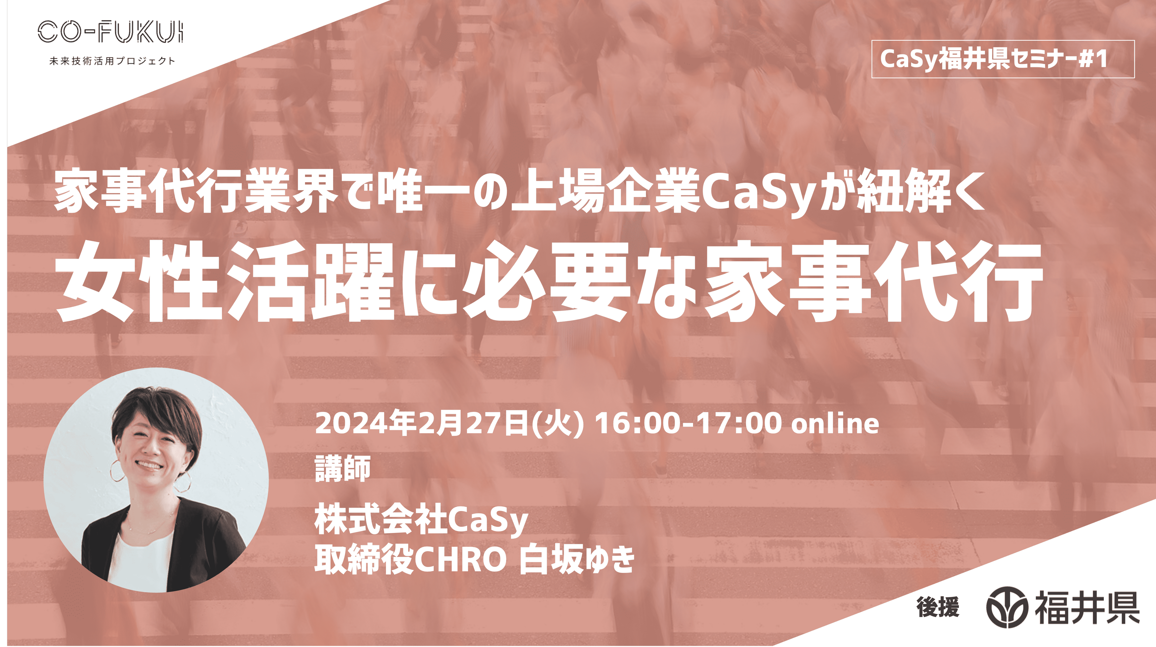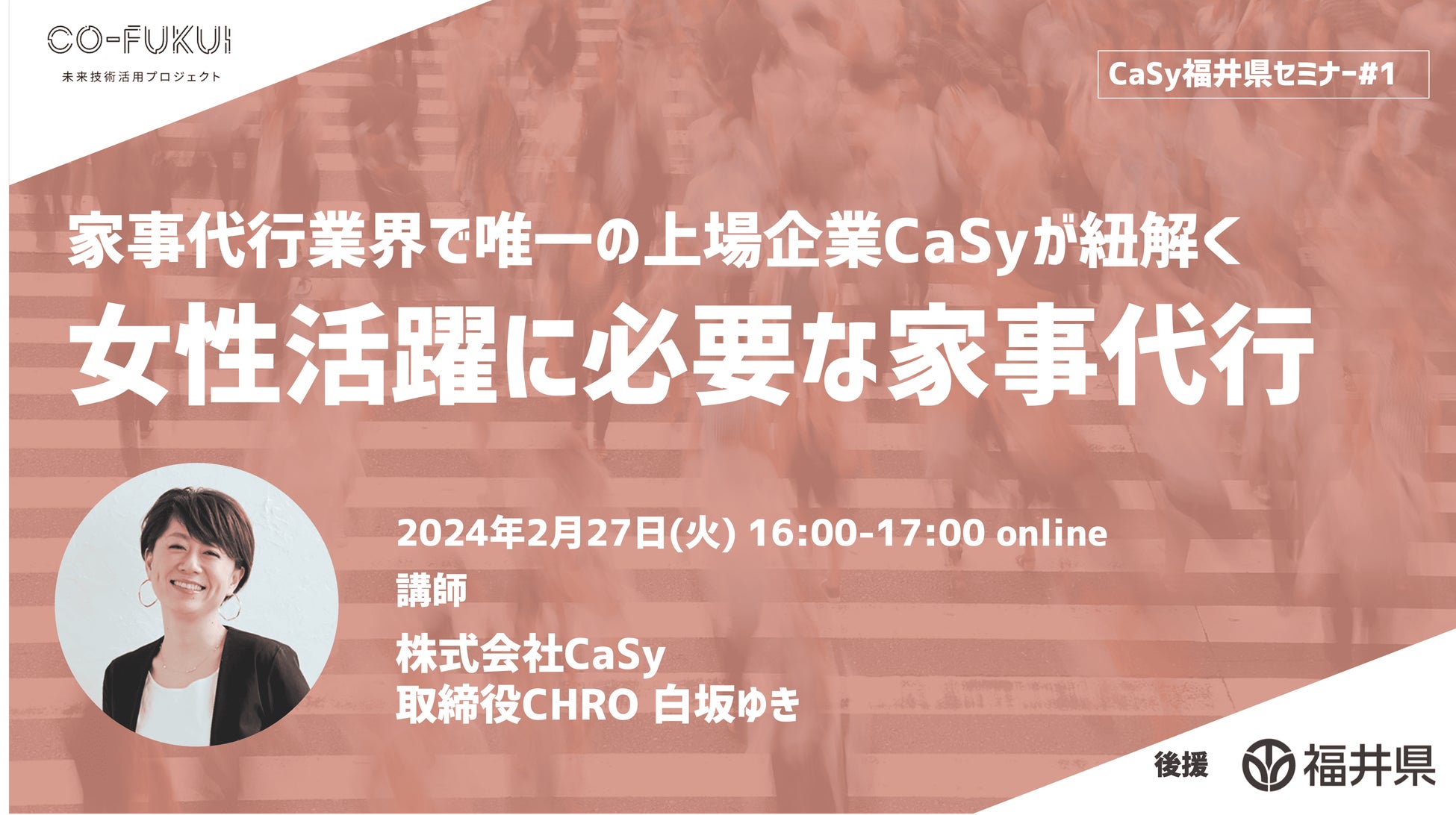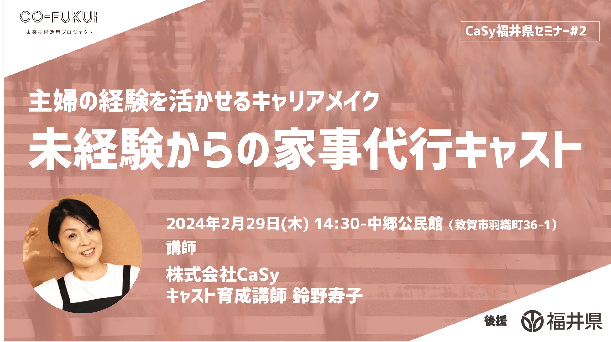 そこで現在、未来技術活用プロジェクトにて県内で実証実験行っているカジーと福井県が共同で、女性活躍推進に必要不可欠な家事代行サービスについて、主婦経験をスキルとして生かすキャリアの作り方、産官連携で取り組む家事代行利用者増への動きについてなどを計3回に分けて講演します。
